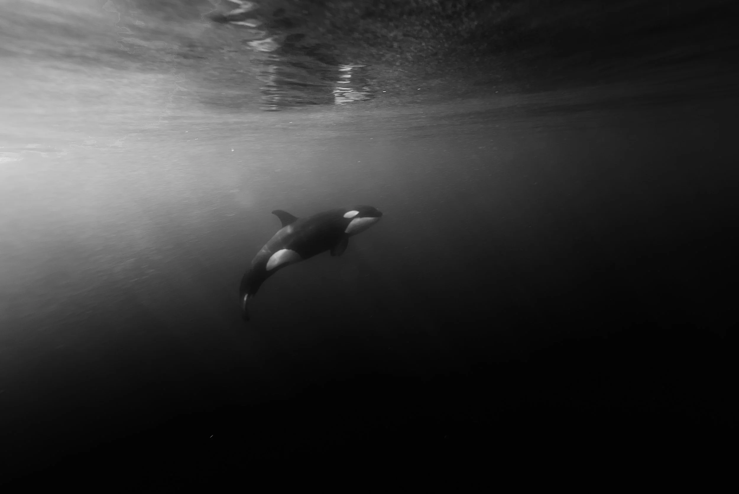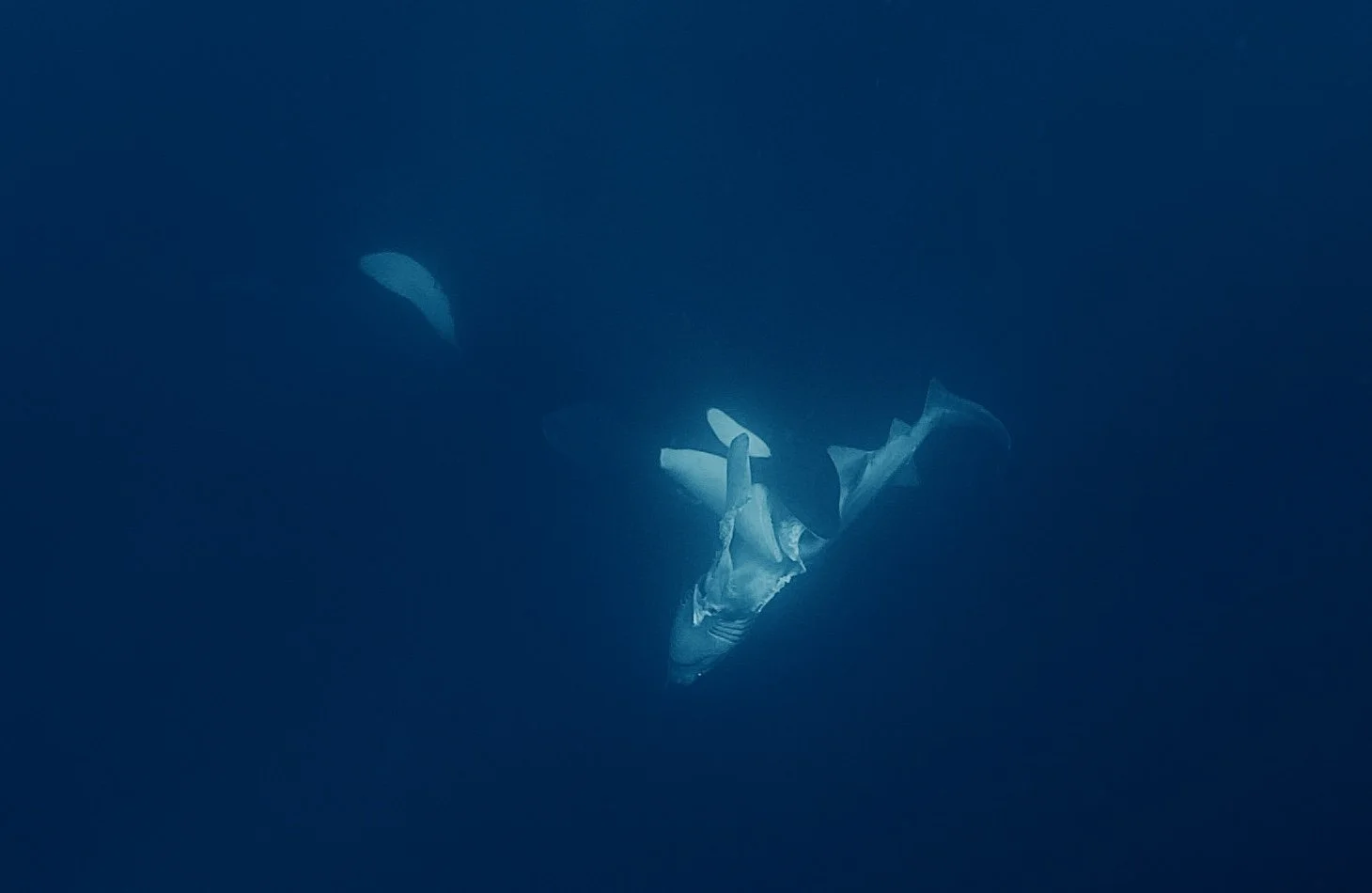They slipped into the water and watched from a distance. The animal was hunting a seven gill shark, a deep water species that rarely appears near the surface in this area.